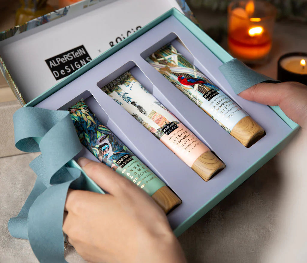 Indulge your skin with the HandCream Trio – Saltbush, Banksia, Eucalyptus from Alperstein Designs. This luxurious set includes three 50 mL tubes of beautifully scented Australian-made hand creams: Saltbush & Macadamia, Banksia Flower, and Eucalyptus & Macadamia. Each cream is richly hydrating, absorbing quickly with no greasy residue. Packaged in an elegant gift box, this trio makes a perfect treat for yourself or a thoughtful present. Natural ingredients, Aussie heritage, delightful scents—it’s a dream cream combo for hands that deserve a little love.