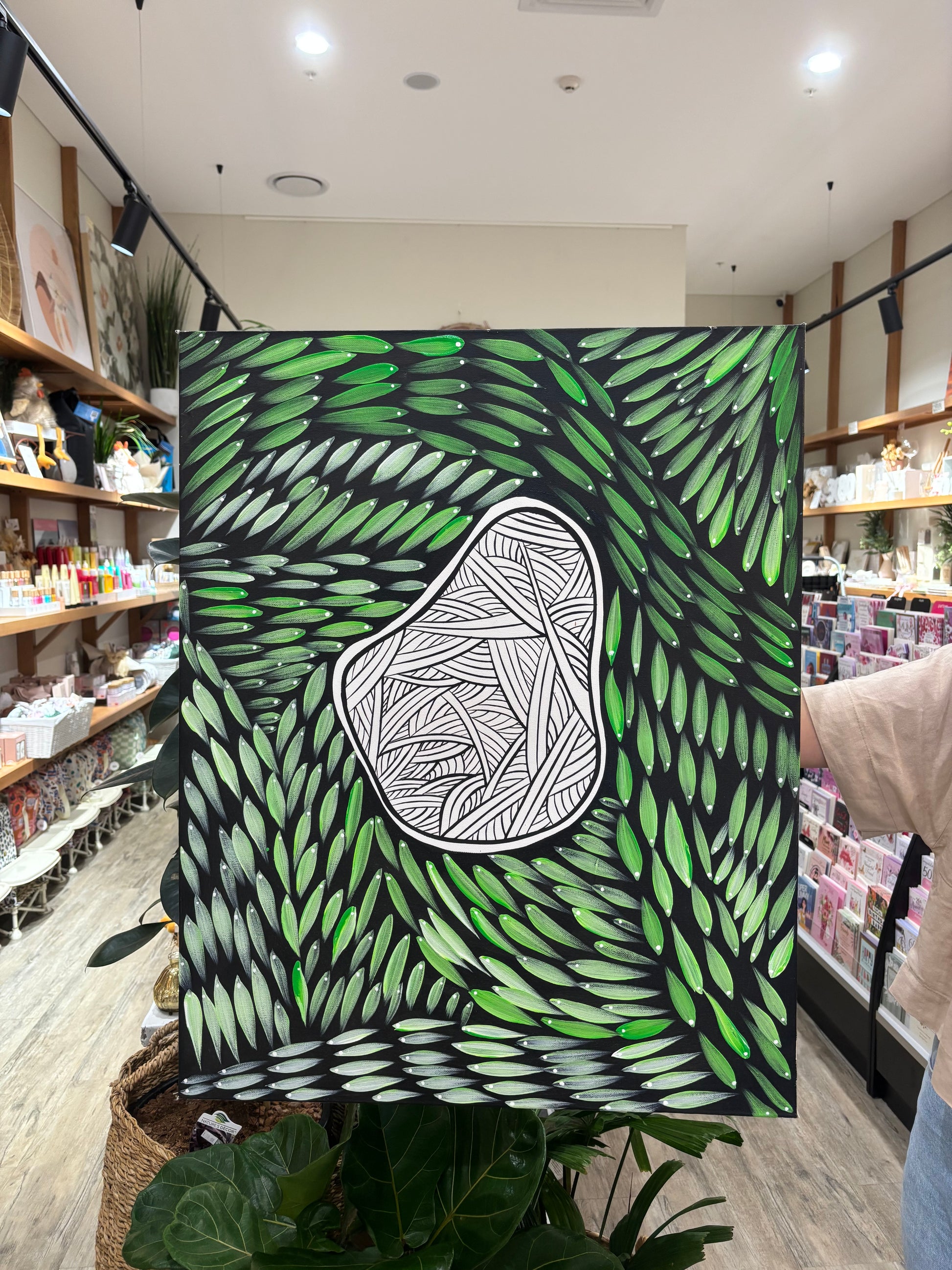 This contemporary Aboriginal artwork by Les Huddleston draws the viewer into its rhythmic movement of green and white brushstrokes, echoing the natural flow of leaves, water, and Country. At its centre, intricate linework symbolises connection, storytelling, and the strength of cultural knowledge. The surrounding patterns radiate with life and energy, reflecting growth, protection, and the cycles of nature.